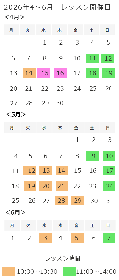 | 対面レッスン | 17:00-20:00 4/4(土), 4/5(日) |